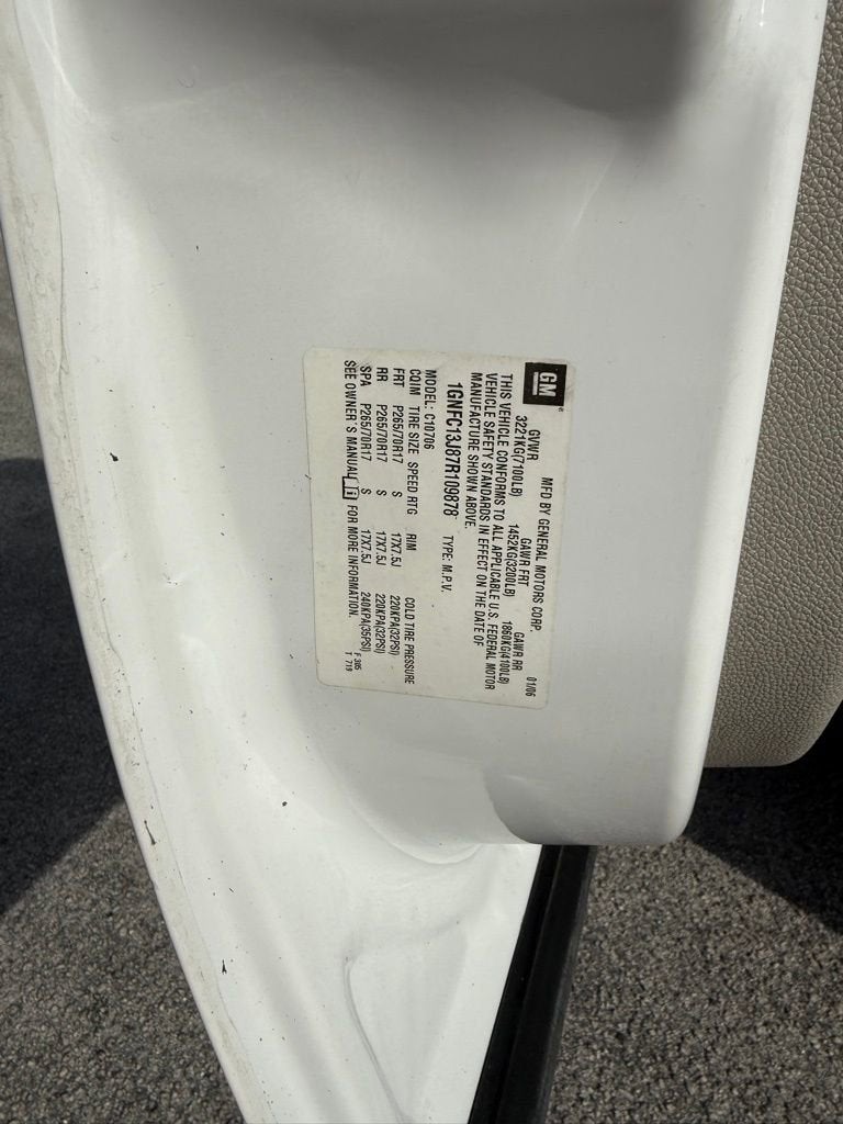 Summit White 2007 Chevrolet Tahoe LT RWD 4-Speed Automatic with Overdrive Vortec 5.3L V8 SFI Dark Titanium/Lt Titanium Cloth, 17 x 7.5 5-Spoke Aluminum Wheels, 1st & 2nd Row Side-Impact Head Curtain Airbags, 2nd Row Reclining Bucket Seats, 3rd Row 2-Passenger Cloth 50/50 Split-Bench Seat, 4-Wheel Disc Brakes, 8 Speakers, ABS brakes, Air Conditioning, Alloy wheels, AM/FM radio: XM, AM/FM Stereo w/MP3/CD/DVD & XM Satellite, AM/FM Stereo w/XM Satellite, Auto-dimming Rear-View mirror, Automatic Dual-Zone Climate Control, Bodyside moldings, Bumpers: body-color, Cargo Shade, CD player, Color-Keyed Door Handles, Compass, Custom Cloth Seat Trim, Custom Leather Appointed Seating Surfaces, Delay-off headlights, Driver door bin, Driver vanity mirror, Dual front impact airbags, Electronic Stability Control, Emergency communication system: OnStar, Floor Console, Front anti-roll bar, Front Bucket Seats, Front Center Armrest, Front dual zone A/C, Front fog lights, Front reading lights, Front Reclining Bucket Seats, Front Round Fog Lamps, Front wheel independent suspension, Fully automatic headlights, Heated door mirrors, Heavy-Duty Rear Locking Differential, Illuminated entry, Low tire pressure warning, Luggage Rack Center Rails, Occupant sensing airbag, Outside temperature display, Overhead console, Panic alarm, Passenger door bin, Passenger vanity mirror, Power Adjustable Pedals For Accelerator & Brake, Power door mirrors, Power driver seat, Power Heated Manual-Folding Outside Mirrors, Power steering, Power Tilt-Sliding Sunroof, Power windows, Preferred Equipment Group 2LT, Premium Smooth Ride Suspension Package, Radio data system, Rear air conditioning, Rear anti-roll bar, Rear audio controls, Rear Audio System Controls, Rear reading lights, Rear seat center armrest, Rear Seat Entertainment System, Rear window defroster, Rear window wiper, Rear-View Camera System, Remote keyless entry, Remote Vehicle Starter System, Roof rack: rails only, Security system, Speed control, Split folding rear seat, Spoiler, Steering Wheel Mounted Audio Controls, Steering wheel mounted audio controls, Tachometer, Tilt steering wheel, Traction control, Trip computer, Ultrasonic Rear Parking Assist, Universal Home Remote, Variably intermittent wipers, Voltmeter, XM Satellite Radio, Dark Titanium/Lt Titanium Cloth.Recent Arrival!
