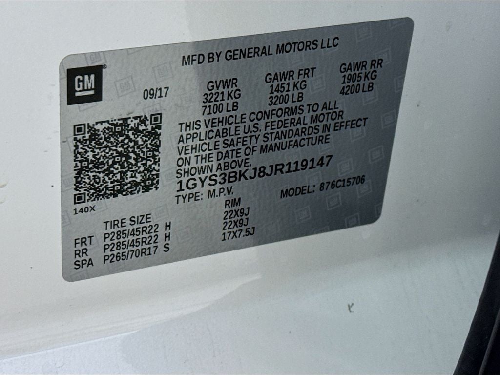 2018 Cadillac Escalade Luxury 12-Way Power Front Passenger Seat Adjuster, 16 Speakers, 2-Position Memory For Driver's Seat Adjuster, 3.23 Axle Ratio, 3rd row seats: split-bench, 4-Wheel Disc Brakes, ABS brakes, Adaptive suspension, Adjustable pedals, Air Conditioning, Alloy wheels, AM/FM radio: SiriusXM, Apple CarPlay/Android Auto, Auto High-beam Headlights, Auto tilt-away steering wheel, Auto-dimming door mirrors, Auto-leveling suspension, Automatic temperature control, Bodyside moldings, Bose Centerpoint 16 Speaker Surround Sound System, Brake assist, Bumpers: body-color, Cargo Shade, CD player, Chrome Exhaust Tip, Compass, Delay-off headlights, Driver Awareness Package, Driver door bin, Driver vanity mirror, Dual front impact airbags, Dual front side impact airbags, DVD-Audio, Electronic Stability Control, Emergency communication system: OnStar and Cadillac connected services capable, Exterior Parking Camera Rear, Forward Collision Alert, Front anti-roll bar, Front Bucket Seats, Front Center Armrest w/Storage, Front dual zone A/C, Front reading lights, Front wheel independent suspension, Fully automatic headlights, Galvano Surround Grille w/Silver Painted Mesh, Garage door transmitter, HD Radio, Heads-Up Display, Heated & Cooled Front Bucket Seats, Heated door mirrors, Heated front seats, Heated rear seats, Heated steering wheel, Illuminated entry, Inclination Sensor, IntelliBeam Automatic High Beam On/Off, Lane Change Alert w/Side Blind Zone Alert, Lane Keep Assist w/Lane Departure Warning, Leather Seating Surfaces, Leather Shift Knob, Leather steering wheel, Low Speed Forward Automatic Braking, Low tire pressure warning, Magnetic Ride Control Suspension, Memory seat, Navigation System, NavTraffic, Occupant sensing airbag, Outside temperature display, Overhead airbag, Overhead console, Panic alarm, Passenger door bin, Passenger vanity mirror, Pedal memory, Power door mirrors, Power driver seat, Power Liftgate, Power moonroof, Power passenger seat, Power steering, Power Tilt-Sliding Sunroof w/Express-Open/Close, Power windows, Preferred Equipment Group 1SB, Radiant Package (LPO), Radio data system, Radio: AM/FM Cadillac User Experience w/Nav, Rain sensing wipers, Rear air conditioning, Rear anti-roll bar, Rear audio controls, Rear Camera Mirror, Rear Camera Washer, Rear Cross-Traffic Alert, Rear reading lights, Rear window defroster, Rear window wiper, Reconfigurable 4-Color Head-Up Display, Remote keyless entry, Roof rack: rails only, Safety Alert Seat, Second Row Bucket Seats, Security system, Single Slot CD/MP3 Player, SiriusXM Satellite Radio, Speed control, Split folding rear seat, Spoiler, Steering wheel memory, Steering wheel mounted audio controls, Tachometer, Telescoping steering wheel, Theft-Deterrent Alarm System, Theft-Deterrent Package, Tilt steering wheel, Traction control, Trip computer, Turn signal indicator mirrors, Variably intermittent wipers, Vehicle Interior Movement Sensor, Ventilated front seats, Wheels: 22 Chrome 7-Split Spoke (LPO), Wheels: 22 x 9 7-Spoke Aluminum w/Premium Paint, Wheels: 22 x 9 Steel (LPO).