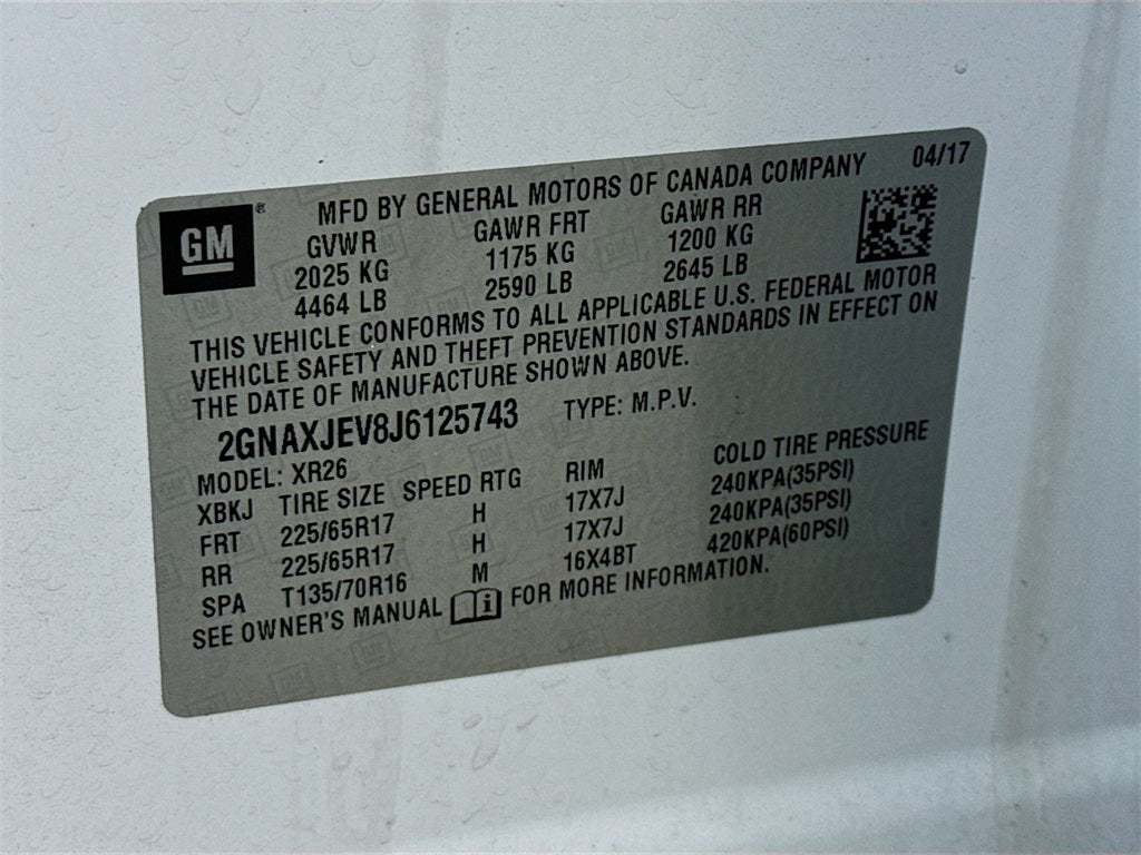 2018 Chevrolet Equinox LT 17 Aluminum Wheels, 3-Spoke Leather-Wrapped Steering Wheel, 3.50 Final Drive Axle Ratio, 4-Wheel Disc Brakes, 6 Speaker Audio System Feature, 6 Speakers, 8-Way Power Driver Seat Adjuster, ABS brakes, Air Conditioning, Alloy wheels, AM/FM radio: SiriusXM, Apple CarPlay/Android Auto, Bluetooth® For Phone, Brake assist, Bumpers: body-color, Compass, Confidence & Convenience Package, Delay-off headlights, Driver Confidence Package, Driver Convenience Package, Driver door bin, Driver vanity mirror, Dual front impact airbags, Dual front side impact airbags, Dual Zone Automatic Climate Control, Electronic Stability Control, Emergency communication system: OnStar and Chevrolet connected services capable, Exterior Parking Camera Rear, Four wheel independent suspension, Front anti-roll bar, Front Bucket Seats, Front Center Armrest, Front Passenger 4-Way Manual Seat Adjuster, Front reading lights, Fully automatic headlights, Heated door mirrors, Heated Driver & Front Passenger Seats, High-Intensity Discharge Headlights, Illuminated entry, Lane Change Alert w/Side Blind Zone Alert, Leather Shift Knob, Low tire pressure warning, Occupant sensing airbag, Outside Heated Power-Adjustable Mirrors, Outside temperature display, Overhead airbag, Overhead console, Panic alarm, Passenger door bin, Passenger vanity mirror, Power door mirrors, Power driver seat, Power steering, Power windows, Preferred Equipment Group 1LT, Premium audio system: Chevrolet MyLink, Premium Cloth Seat Trim, Radio data system, Radio: Chevrolet MyLink AM/FM Stereo, Rear anti-roll bar, Rear Cross Traffic Alert, Rear Park Assist w/Audible Warning, Rear Power Liftgate, Rear reading lights, Rear seat center armrest, Rear window defroster, Rear window wiper, Remote keyless entry, Remote Vehicle Starter System, Security system, SiriusXM Satellite Radio, Speed control, Speed-sensing steering, Split folding rear seat, Spoiler, Steering wheel mounted audio controls, Tachometer, Telescoping steering wheel, Tilt steering wheel, Traction control, Trip computer, Universal Home Remote, USB Port & Auxiliary Input Jack, Variably intermittent wipers.