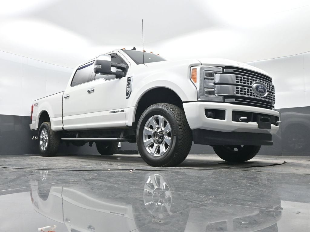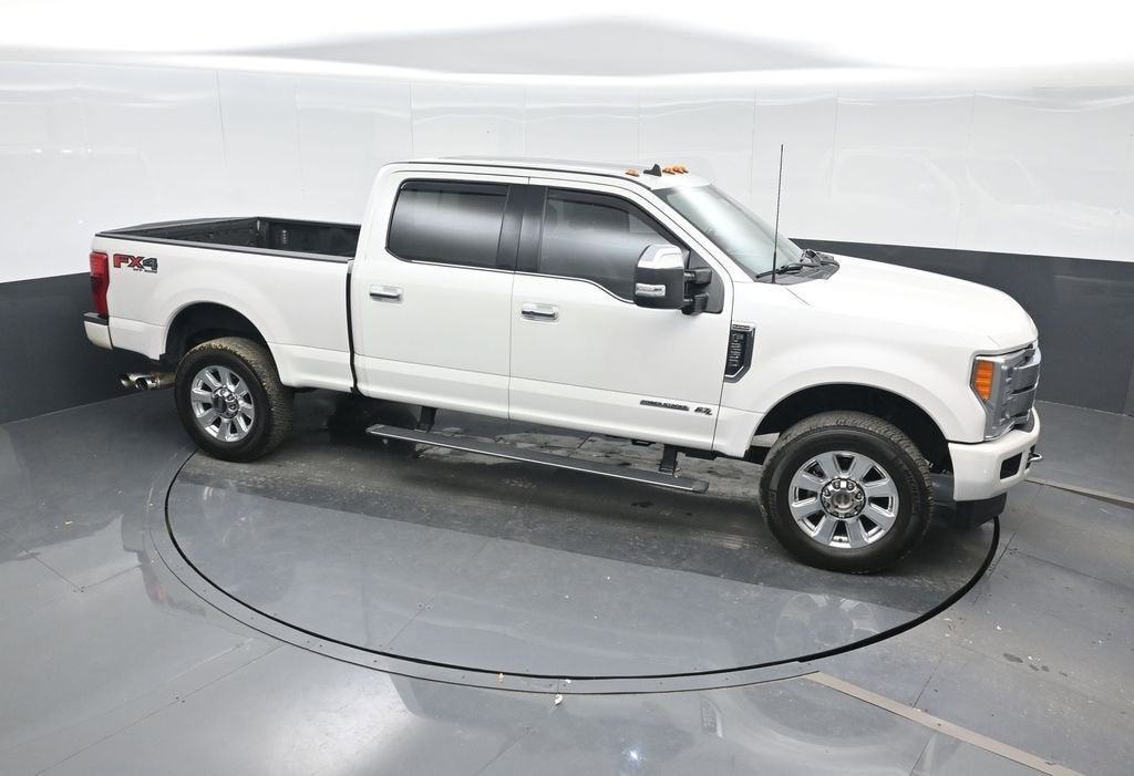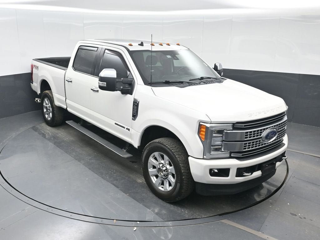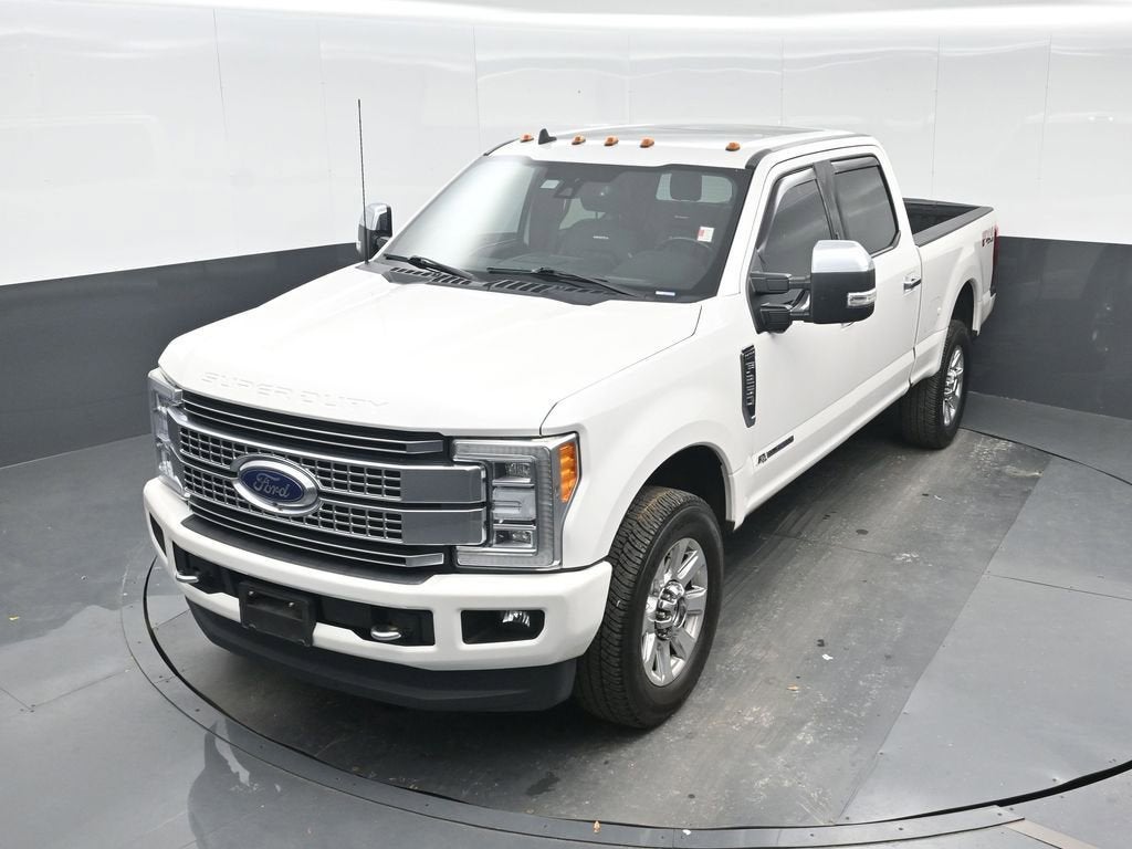 White Platinum 2019 Ford F-250SD Platinum 4WD TorqShift 6-Speed Automatic Power Stroke 6.7L V8 DI 32V OHV Turbodiesel 4WD, 10 Speakers, 110V/400W Outlet, 3.73 Axle Ratio, 4-Wheel Disc Brakes, ABS brakes, Adaptive Cruise Control & Collision Warning, Adjustable pedals, Air Conditioning, All-Weather Floor Mats, Alloy wheels, AM/FM radio: SiriusXM, AppLink/Apple CarPlay and Android Auto, Auto-dimming Rear-View mirror, Automatic temperature control, Brake assist, Compass, Delay-off headlights, Driver door bin, Driver vanity mirror, Dual front impact airbags, Dual front side impact airbags, Electronic Stability Control, Emergency communication system: SYNC 3 911 Assist, Exterior Parking Camera Rear, Flow-Through Console, Front anti-roll bar, Front Bucket Seats, Front Center Armrest, Front dual zone A/C, Front fog lights, Front reading lights, Fully automatic headlights, FX4 Off-Road Package, GVWR: 10,000 lb Payload Package, Heated door mirrors, Hill Descent Control, Illuminated entry, Leather steering wheel, LED Roof Clearance Lights, Low tire pressure warning, Off-Road Specifically Tuned Shock Absorbers, Outside temperature display, Overhead airbag, Overhead console, Panic alarm, Passenger door bin, Passenger vanity mirror, Power door mirrors, Power driver seat, Power passenger seat, Power steering, Power windows, Radio data system, Radio: B&O Sound System by Bang & Olufsen, Rear Inflatable Seat Belts, Rear Parking Sensors, Rear reading lights, Rear seat center armrest, Rear step bumper, Rear window defroster, Remote keyless entry, Security system, SiriusXM Radio, Speed control, Split folding rear seat, Steering wheel mounted audio controls, SYNC 3 Communications & Entertainment System, Tachometer, Telescoping steering wheel, Tilt steering wheel, Traction control, Trip computer, Turn signal indicator mirrors, Twin Panel Power Moonroof, Unique FX4 Off-Road Box Decal, Upfitter Switches (6), Variably intermittent wipers, 4WD.