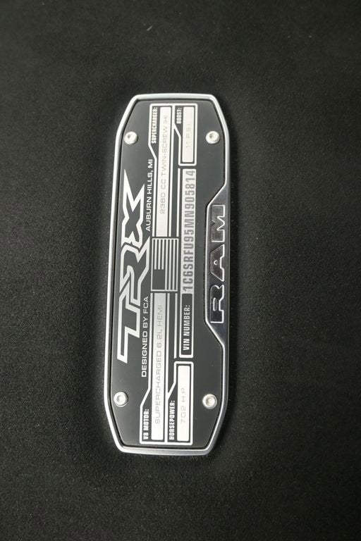 Diamond Black Crystal Pearlcoat 2021 Ram 1500 TRX 4WD 8-Speed Automatic 6.2L Supercharged HEMI V8 SRT 10 Speakers, 3.55 Rear Axle Ratio, 4 Way Front Headrests, 4-Wheel Disc Brakes, ABS brakes, Adaptive suspension, Air Conditioning, Alloy wheels, AM/FM radio: SiriusXM with 360L, Apple CarPlay/Android Auto, Auto High-beam Headlights, Auto-dimming door mirrors, Auto-dimming Rear-View mirror, Automatic temperature control, Black Exterior Mirrors, Body Color Door Handles, Brake assist, Bucket Seats, Cloth/Vinyl Bucket Seats, Compass, Delay-off headlights, Driver door bin, Driver/Passenger Wrapped Assist Handles, Dual front impact airbags, Dual front side impact airbags, Electronic Stability Control, Emergency communication system: SiriusXM Guardian, Exterior Mirrors Courtesy Lamps, Exterior Mirrors w/Heating Element, Exterior Mirrors w/Supplemental Signals, Front anti-roll bar, Front Bucket Seats, Front Center Armrest w/Storage, Front Door Accent Lighting, Front dual zone A/C, Front fog lights, Front License Plate Bracket, Front reading lights, Front wheel independent suspension, Full Length Premium Upgraded Floor Console, Fully automatic headlights, harman/kardon 19 Speaker Premium Sound, Heated door mirrors, Heated Front Seats, Heated Steering Wheel, Illuminated entry, IP LED Ambient Light Pipe, Leather Shift Knob, Leather steering wheel, Leather Trimmed Bucket Seats, Leather/Suede Flat-Bottom Steering Wheel, Low tire pressure warning, Luxury Front Door Trim Panel, MOPAR Rock Rails, Navigation System, Occupant sensing airbag, Outside temperature display, Overhead airbag, Overhead console, Panic alarm, ParkView Rear Back-Up Camera, Passenger door bin, Passenger vanity mirror, Pick-Up Box Lighting, Power 4-Way Driver Lumbar Adjust, Power 4-Way Passenger Lumbar Adjust, Power 8-Way Driver & Passenger Seats, Power Adjustable Pedals, Power door mirrors, Power driver seat, Power steering, Power windows, Power-Folding Mirrors, Premium Wrapped IP Bezel, Quick Order Package 29Y, Radio data system, Radio: Uconnect 12 w/Navigation, Rain Sensitive Windshield Wipers, Rear Door Accent Lighting, Rear seat center armrest, Rear step bumper, Rear Underseat Compartment Storage, Rear Window Defroster, Remote keyless entry, Remote Start System, Security system, Speed control, Split folding rear seat, Sport steering wheel, Steering wheel mounted audio controls, Sun Visors w/Illuminated Vanity Mirrors, Tachometer, Telescoping steering wheel, Tilt steering wheel, Traction control, Trip computer, TRX Level 1 Equipment Group, Turn signal indicator mirrors, Universal Garage Door Opener, Variably intermittent wipers, Voltmeter, Wheels: 18 x 9 Black Paint/Polish Aluminum.Awards:* Motor Trend Automobiles of the year * JD Power Automotive Performance, Execution and Layout (APEAL) Study