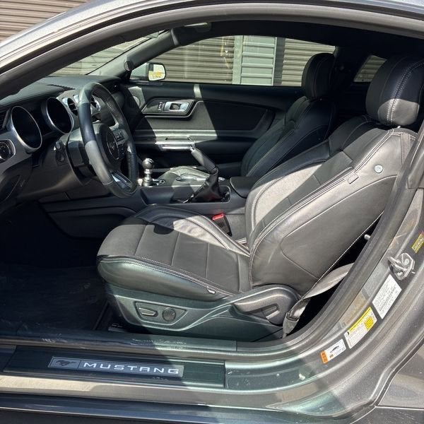 Carbonized Gray Metallic 2023 Ford Mustang GT RWD 6-Speed Manual 5.0L V8 Ti-VCT 3.55 Limited Slip Rear Axle, 4-Wheel Disc Brakes, 4G LTE Wi-Fi Hotspot Removal, ABS brakes, Air Conditioning, Alloy wheels, AM/FM Stereo, Ambient Lighting w/MyColor, Auto High-beam Headlights, Auto-dimming Rear-View mirror, Brake assist, Bumpers: body-color, Compass, Delay-off headlights, Driver door bin, Driver vanity mirror, Dual front impact airbags, Dual front side impact airbags, Electronic Stability Control, Emergency communication system: 911 Assist, Equipment Group 301A, Exterior Parking Camera Rear, Four wheel independent suspension, Front anti-roll bar, Front Bucket Seats, Front Center Armrest, Front fog lights, Front reading lights, Fully automatic headlights, Illuminated Door-Sill Scuff Plates, Illuminated entry, Knee airbag, Leather Shift Knob, Low tire pressure warning, Occupant sensing airbag, Outside temperature display, Overhead airbag, Overhead console, Panic alarm, Passenger door bin, Passenger vanity mirror, Power door mirrors, Power driver seat, Power passenger seat, Power steering, Power windows, Radio data system, Rain sensing wipers, Rear anti-roll bar, Rear Parking Sensors, Rear window defroster, Remote keyless entry, Security system, Speed control, Speed-sensing steering, Speed-Sensitive Wipers, Split folding rear seat, Spoiler, Steering wheel mounted audio controls, Tachometer, Telescoping steering wheel, Tilt steering wheel, Traction control, Trip computer, Variably intermittent wipers, Voltmeter, Wheels: 18 x 8 Machined-Face Aluminum, Wheels: 18 x 8 Machined-Face Aluminum (641).